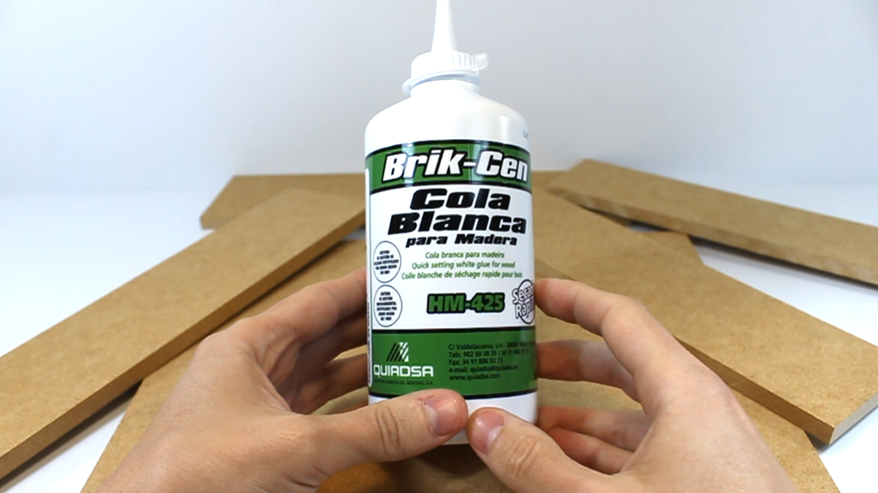 Para pegar la madera, vamos a utilizar cola para madera. Yo voy a utilizar esta de la marca Quiadsa (Especificaciones de la Cola) que es especial para madera, además es de secado rápido, algo que sinceramente, nos viene genial a la hora de trabajar este tipo de manualidades, ya que nos reduce muchísimo el tiempo de espera. Para pegar los listones, aplicaremos un pequeño cordón de cola, en uno de los extremos a pegar, y seguidamente, colocamos la pieza encima.